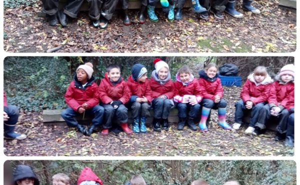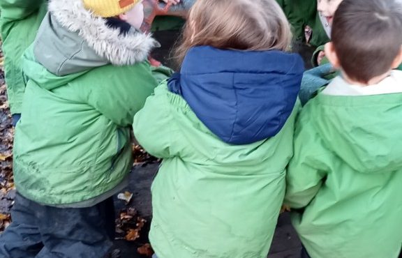 This afternoon the nursery children wrapped up warm to go to the woods. We moved around lots to try not to get cold.