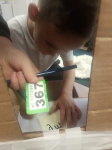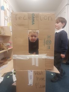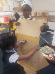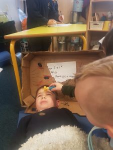 Our deconstructed role play can look like just any other pile of boxes but as soon as the children get in there those boxes come to life. Today someone picked up a bandage and said their leg hurt… Next thing you know the class 1 magic cupboard was opened and out came the stethoscopes. The children then built a hospital. The reception desk was manned constantly and the boys used cloakroom tickets to give patients a number. The x Ray machine idea was amazing, you stepped inside and your Doctor drew what they saw on the xrays. Luckily we had some real xrays we could look at as well.