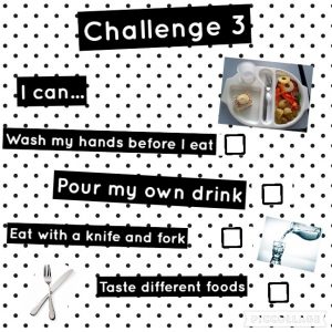Now the next big challenge will be lunch time. There will be lots of lovely kind dinner ladies to help you with your lunch, but it would be fantastic if you are experts at feeding yourself when you come to big school!