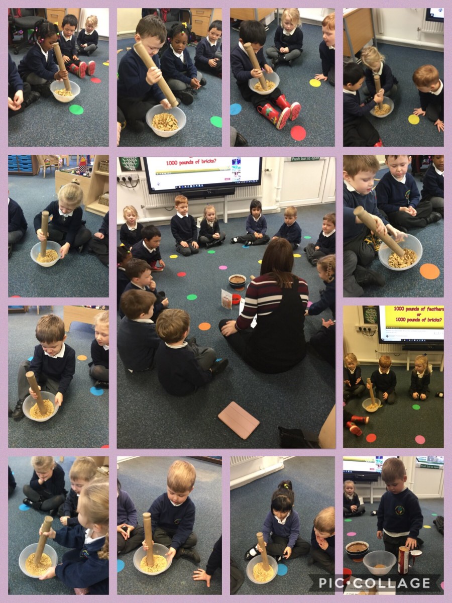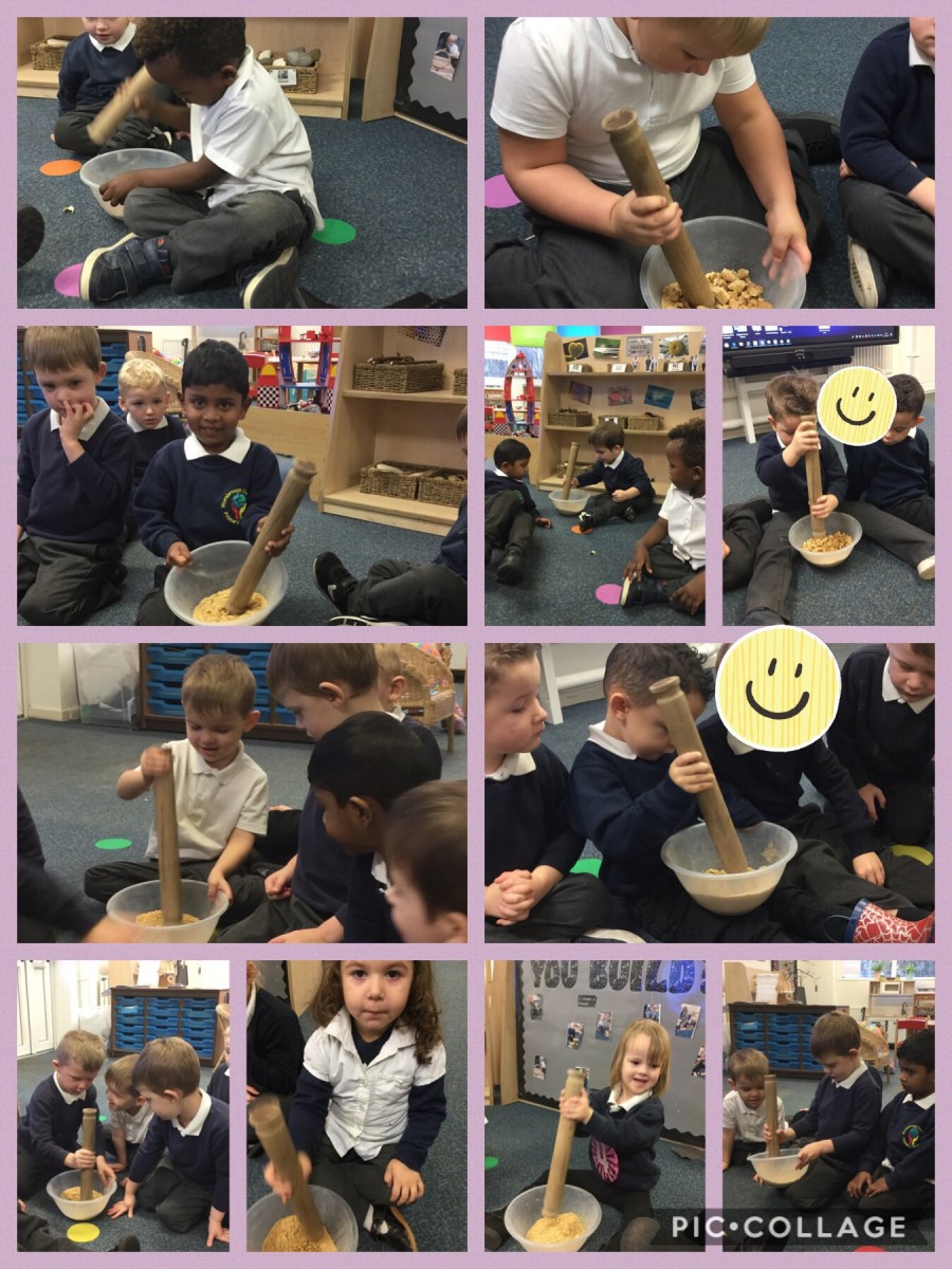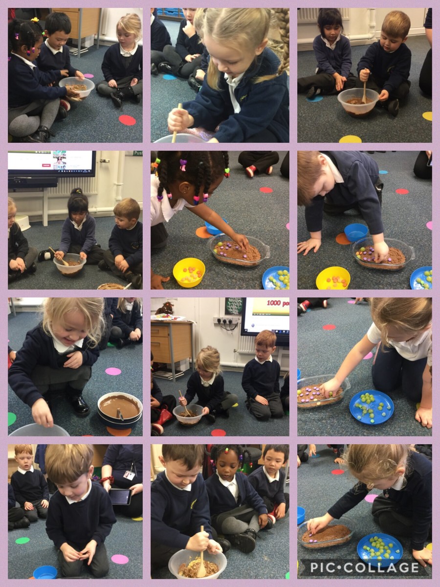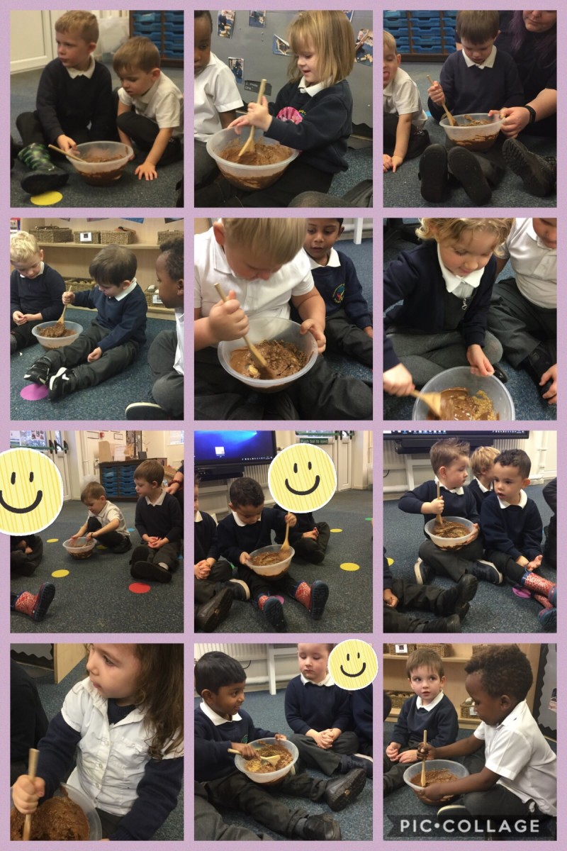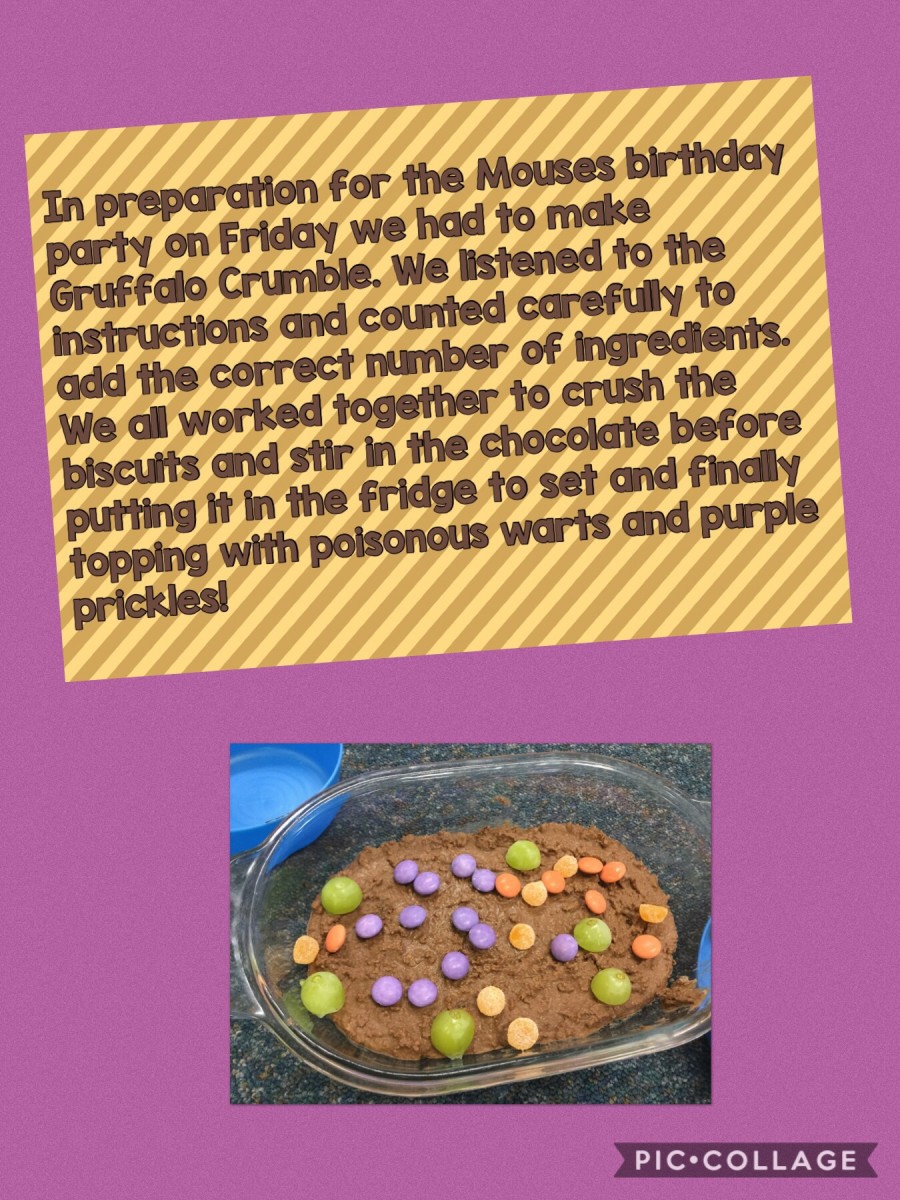 This week in nursery we listened carefully to instructions and did careful counting to make Gruffalo Crumble for the mouses birthday party.