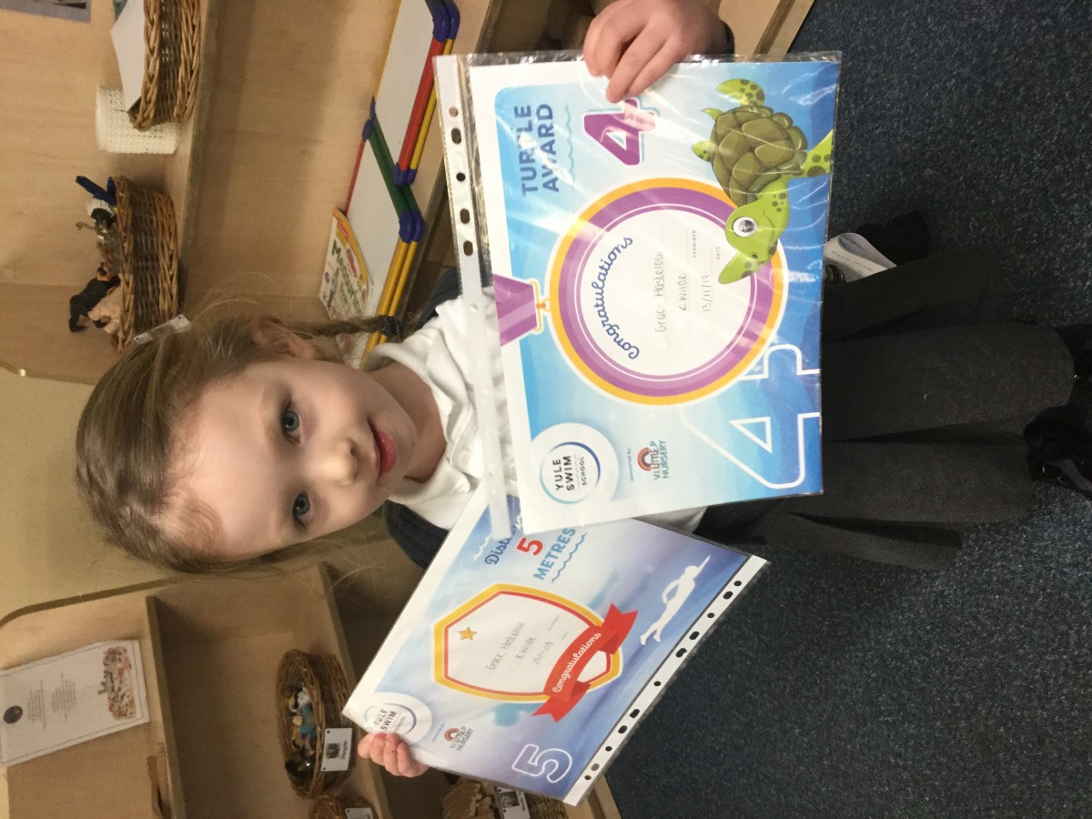 We love to hear about the things you have been doing at home. Today Grace brought a swimming certificate to school, she swam 5 meters! Wow!