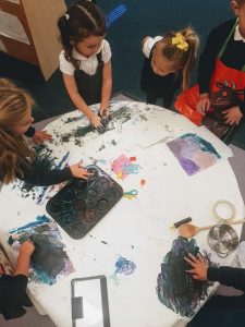we used our fingers to create paintings of Bonfires and fireworks. So much discussion about how the paint felt and the colours we could mix. Henley taught his friends the ‘Remember, remember the 5th of November’ rhyme.